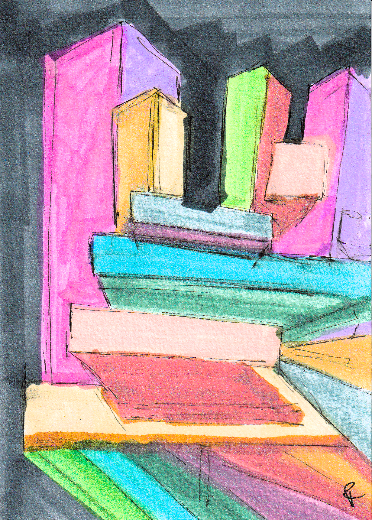 Und gemeinsam betrachteten wir die Stadt aus uns selbst. Die rosa und violetten und gelben und grünen und türkisen Türme. Die geschichteten Plattformen der Kompromisse. Das graue Gewebe des Kontextes, das alles zusammenhielt.