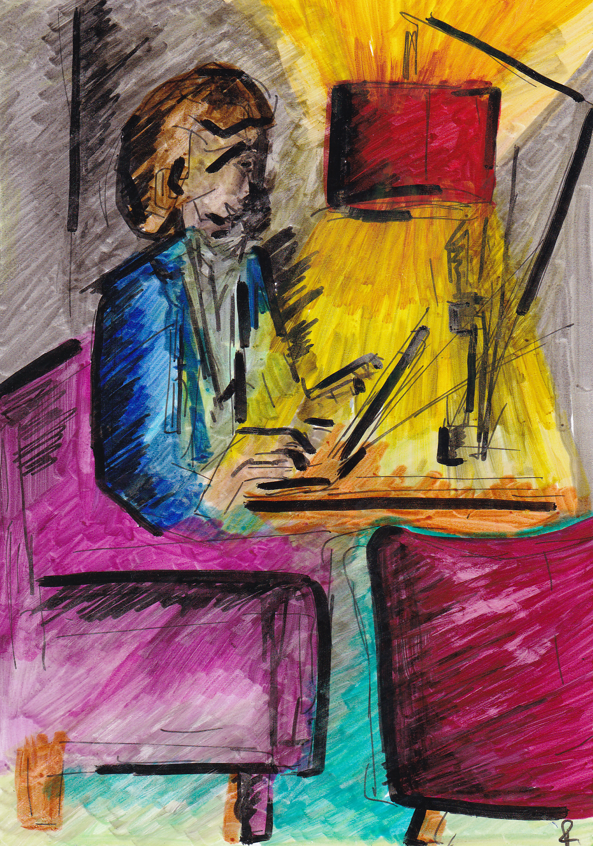 The lamp pours yellow thoughts
