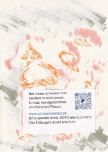 Bei meiner neuen Postkarten-Aktion tausche ich die aktuellen Bilder im Sub gegen meine Schweine-Zeichnungen im Postkartenformat DIN A6 sukzessive aus. Jedes Bild ist ein Original und ein handgezeichnetes und signiertes Format. Ob es ein echter Pflaum ist – lol – könnt Ihr in diesem Blog überprüfen. Ich lade meine schwulen Schweine hier nach und nach hoch.