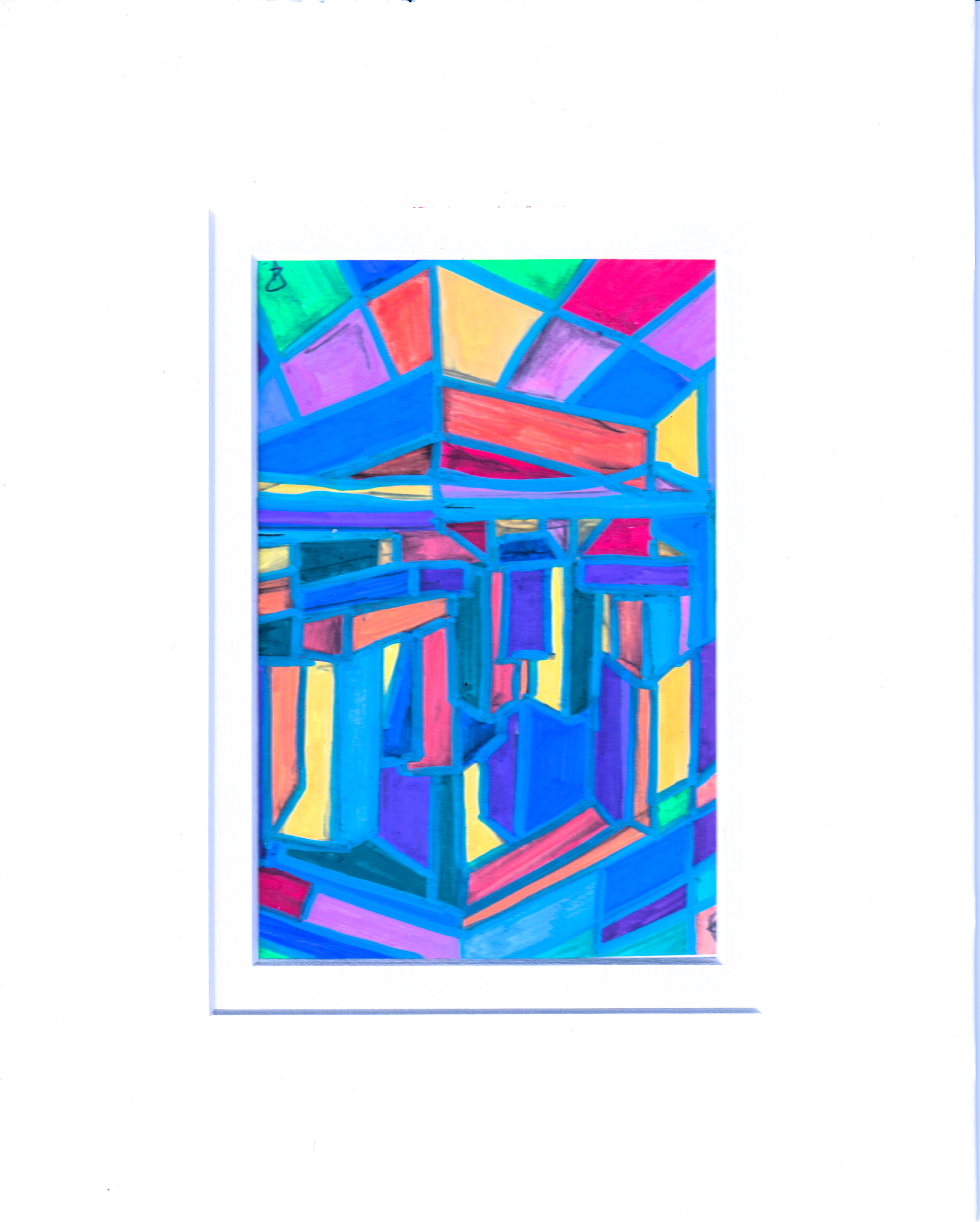 The building above was concerned. It was a cheerful arrangement of colored squares—pink, yellow, magenta, coral—assembled with optimistic geometry. Below, in the water’s surface, its reflection had become something entirely different: a deep blue scaffolding, a skeletal infrastructure, columns descending into uncertain depths.