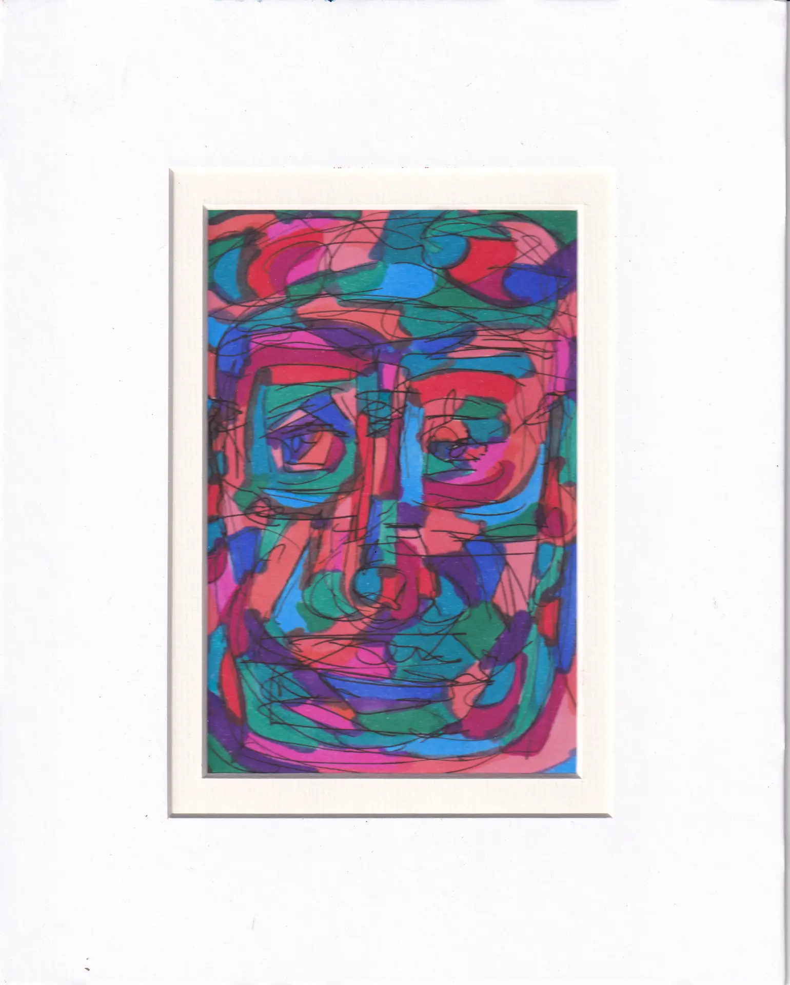 Sein Gesicht zerbricht in Ausschüsse aus Farbe, jeder Streifen eine andere Theorie des Sehens, während die schwarzen Linien Grenzen skizzieren, die niemand befolgt.