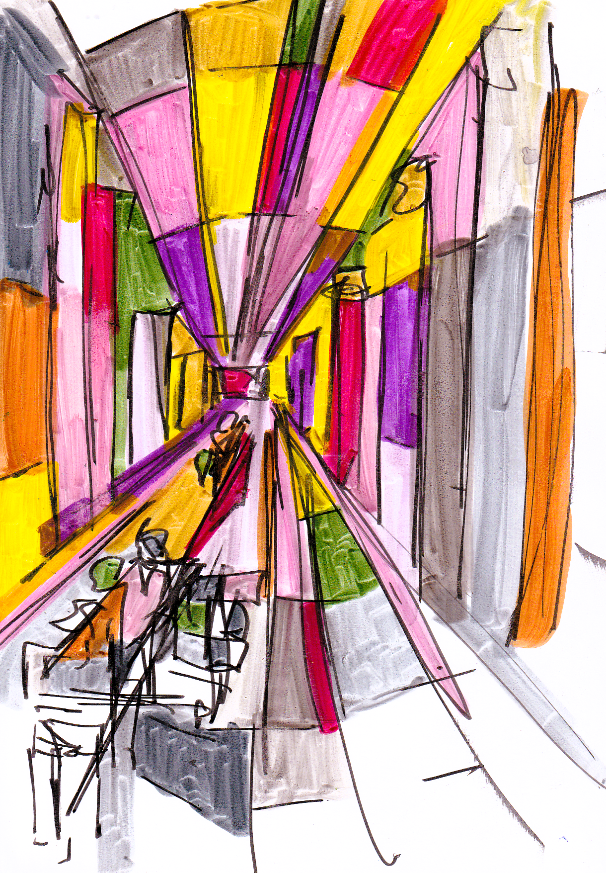 The corridor contracted and expanded with the rhythm of breathing. Yellow lungs, pink bronchia, violet alveoli exchanging oxygen for bewilderment. The perspective point moved closer, then retreated, like a train that couldn’t decide whether its destination was arrival or departure.